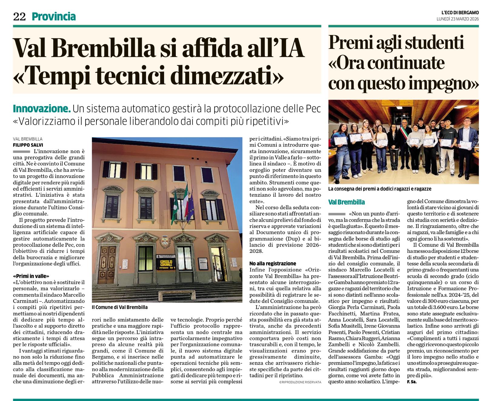 Il Comune di Val Brembilla adotta un sistema di IA per la protocollazione automatica delle PEC.